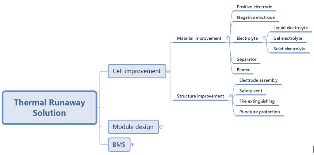 Currently, most of the batteries used in EVs are lithium-ion batteries, whose structure consists of a positive electrode, a negative electrode and an electrolyte. A separator is displaced between the positive and negative electrodes. In order to increase energy density, the electrodes and separator are stacked or wound in multiple layers to form a cylindrical, a pouch type or a prismatic battery cell. As shown in Fig.4, the solution for battery thermal runaway from the perspective of cell improvement includes material improvement such as positive and negative electrodes materials, and the improvement of cell structure.